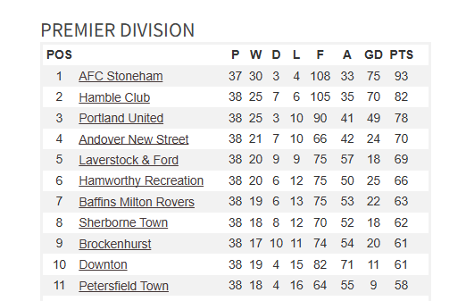 I always start my season review with the big picture. Top marks to AFC Stoneham, what a wonderful season. Best team in the league by a distance, title wrapped up when they still had 6 games to play, yet another season with over 90 points and thoroughly deserving champions. There was only one team in the league that they couldn’t beat (take a bow, Badgers!). They’re still in three other cup competitions I believe, quite apart from the FA Vase – and all this after suffering heartbreak for the last two or three years. No praise too high.